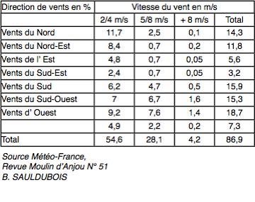 Les vents utiles pour le fonctionnement du moulin représentent environ 30 % du temps, soit donc sur une année 2 800 Heures.